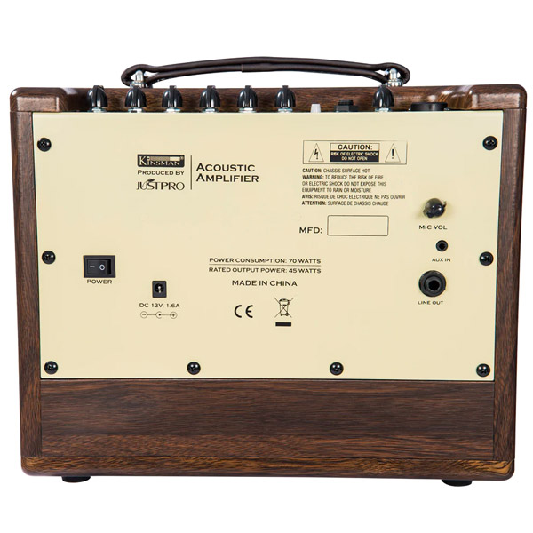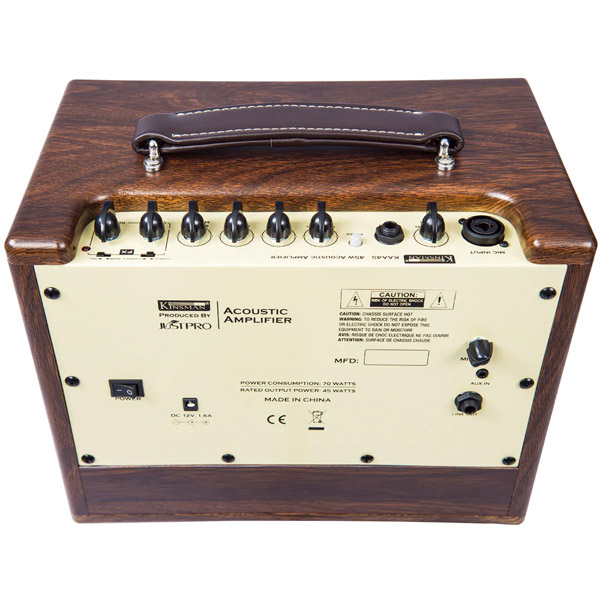 Rounding off the KAA45's exceptional flexibility, the amplifier can be powered with the included 12v adaptor or by 8 'AA' batteries which provide up to four hours' performance time – long enough for a full afternoon's busking or recording. Finally, an easy grip carry handle, wooden panelling and brown grill cloth bearing the familiar Kinsman logo deliver the classic acoustic amplifier aesthetic.